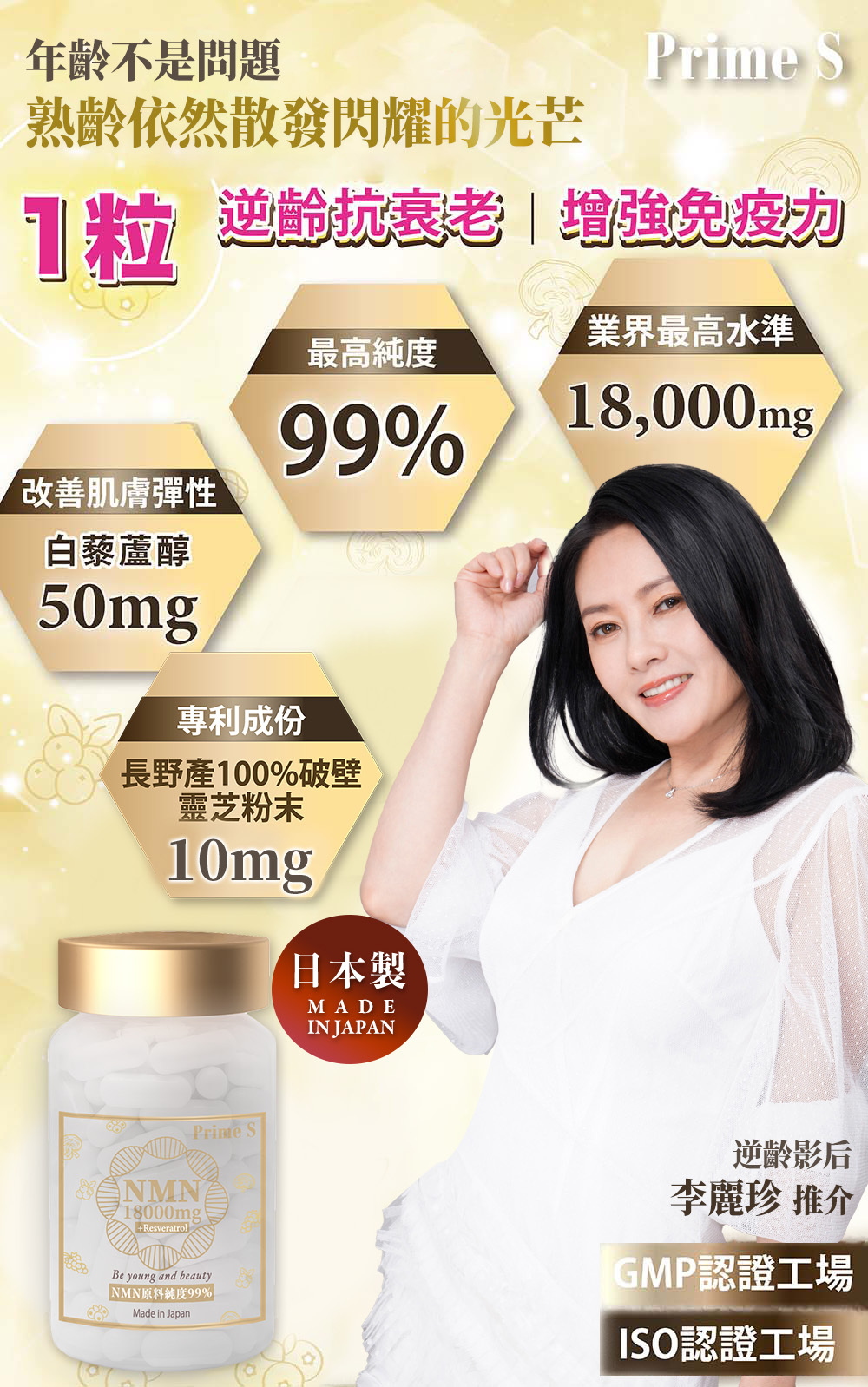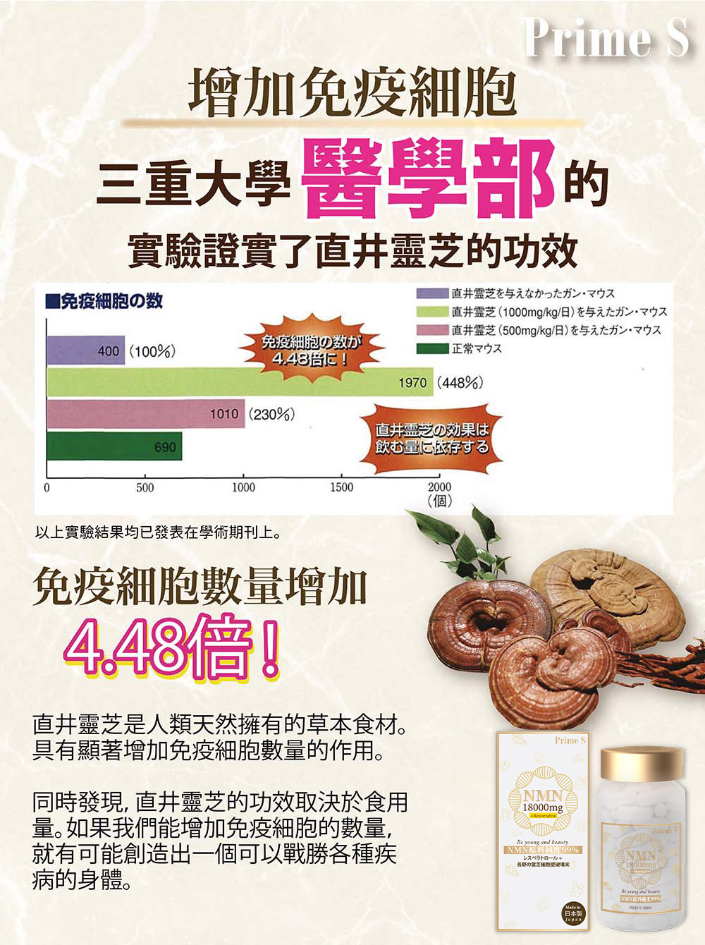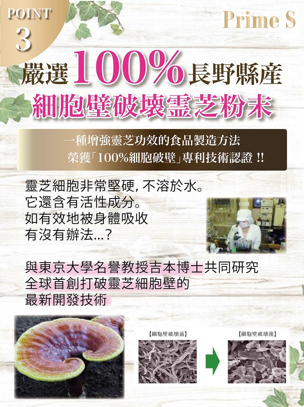 PRIME S與日本專業科研團隊共同研發Prime S NMN破壁靈芝粉末膠囊,嚴選日本頂級的長野直井靈芝,並採用先進的專利破壁技術,精製後的粉末破璧率高達100%,功效顯著,有效去除雜質,成功保存靈芝粉末內活性成分,有助提高人體免疫力,抗衰老、強化心血循環、改善消化及呼吸系統、改善新陳代謝、提升睡眠質素、舒緩壓力,與NMN全方位發揮抗衰老協同效應,將逆齡抗衰老、增強免疫力功效提升到最高。