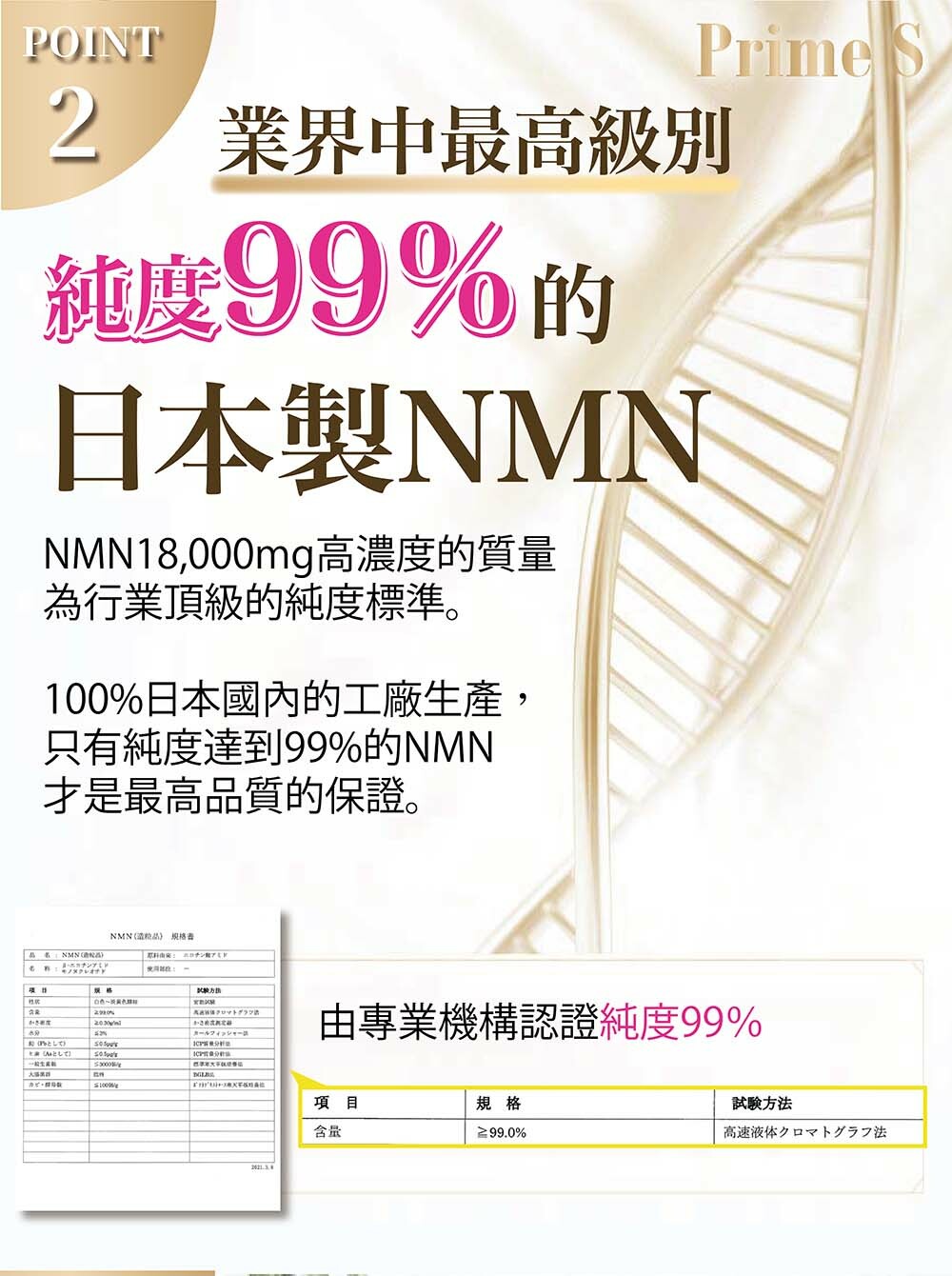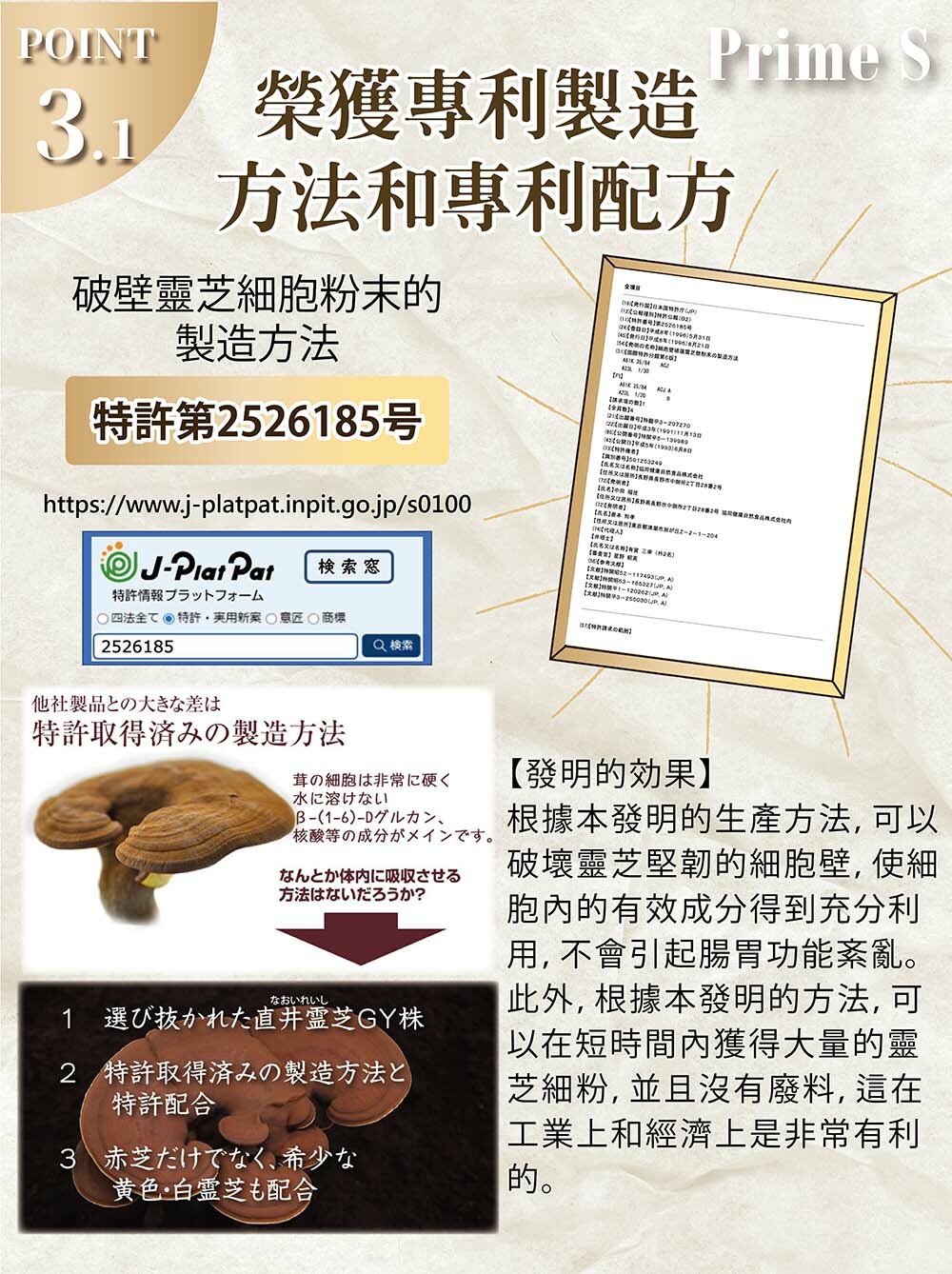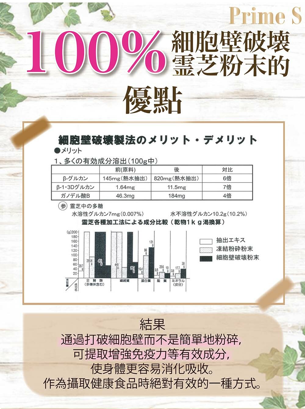 PRIME S與日本專業科研團隊共同研發Prime S NMN破壁靈芝粉末膠囊,嚴選日本頂級的長野直井靈芝,並採用先進的專利破壁技術,精製後的粉末破璧率高達100%,功效顯著,有效去除雜質,成功保存靈芝粉末內活性成分,有助提高人體免疫力,抗衰老、強化心血循環、改善消化及呼吸系統、改善新陳代謝、提升睡眠質素、舒緩壓力,與NMN全方位發揮抗衰老協同效應,將逆齡抗衰老、增強免疫力功效提升到最高。
