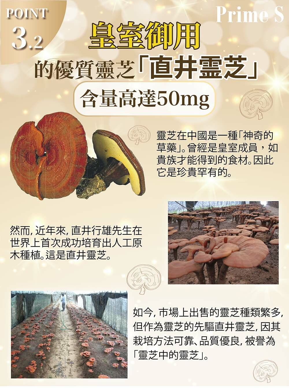 古時天皇御用的直井靈芝由於栽培法的準確性和品質高而被稱爲「靈芝中的靈芝」,受到了世界各國的關注。在日本高山種植製造零污染,品質保証;