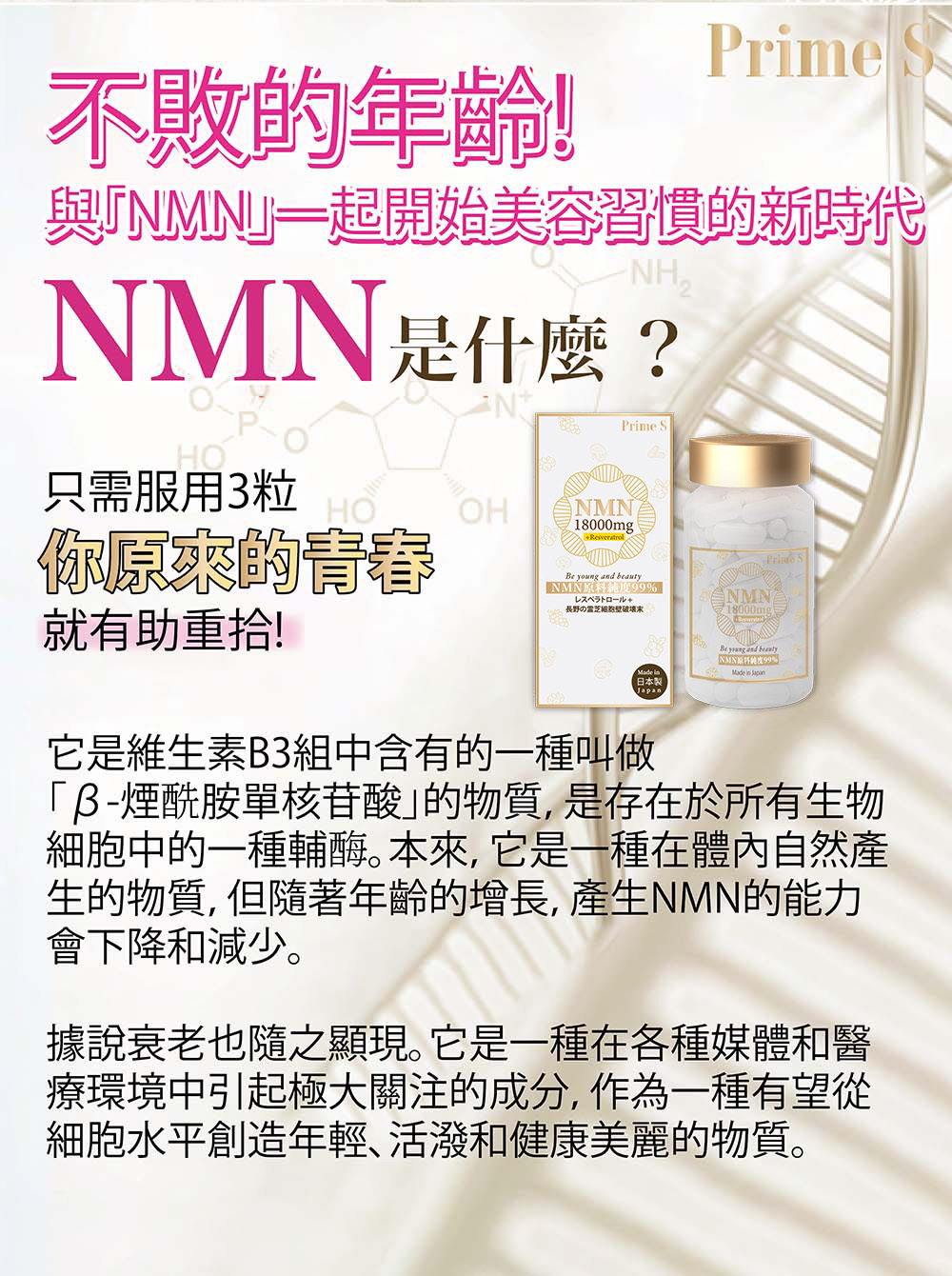 超高含量成份:嚴選特高含量NMN 18,000mg,NMN為健康因子NAD+的前體物質,有助修復細胞,能直接提高體內NAD+水平,從而修復受損DNA、激活細胞年輕化,增強抵抗力、全面提高身體機能、抗衰老。